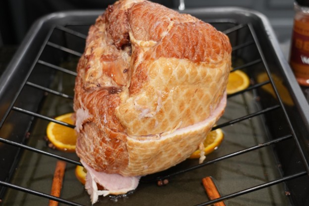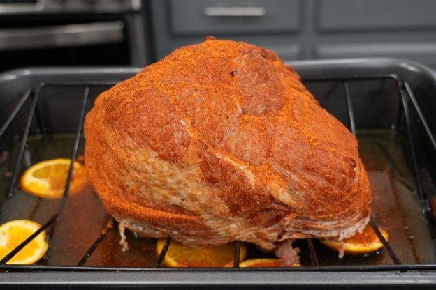- Remove the ham from all packaging and pat it completely dry. Season the outside generously with BBQ seasoning — this adds savory balance and helps build those crispy caramelized edges. Place a wire rack into a roasting pan. Beneath the rack, pour 2–3 cups of apple juice and add sliced oranges, cinnamon sticks, and a pinch of cloves. This creates a flavorful steaming environment that keeps the ham juicy and aromatic. Set the seasoned ham on the rack, cut side down.