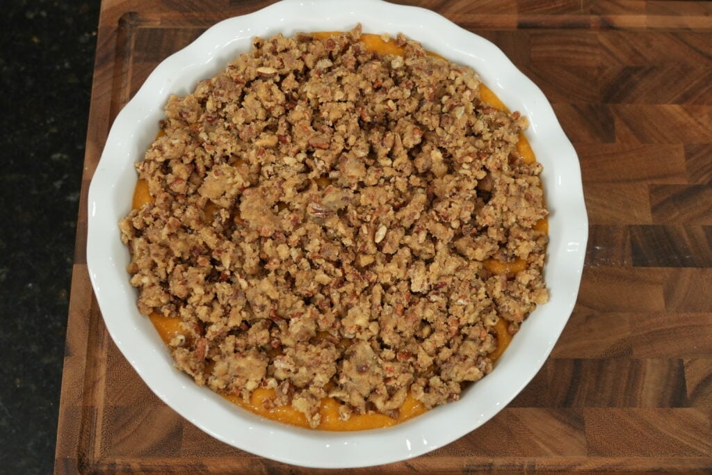 - To make the pecan topping, combine the crushed pecans, brown sugar, flour, melted butter, salt, and a touch of cinnamon in a bowl. Stir until the mixture becomes crumbly and well coated, then sprinkle it evenly over the sweet potato filling.