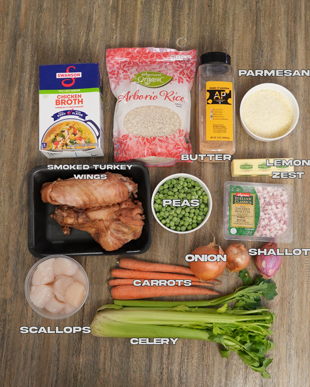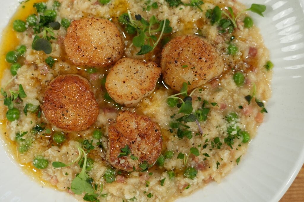 🥣 Key Ingredients: Sea scallops, arborio rice, pancetta, parmesan, peas