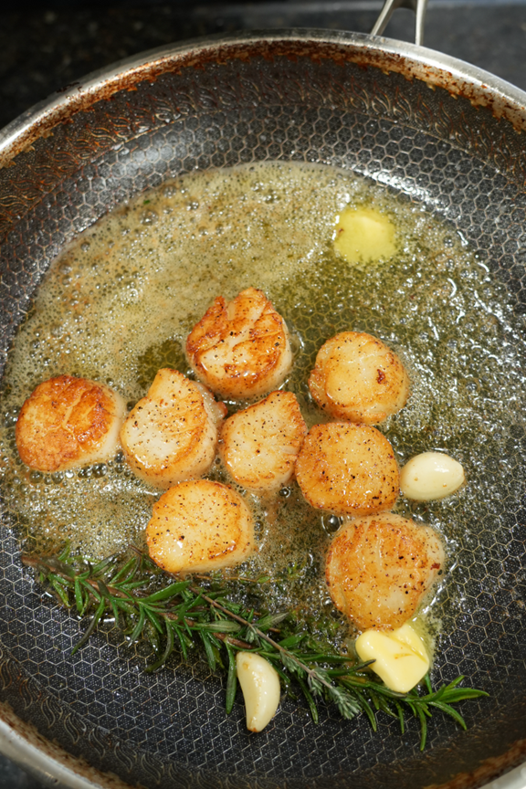 - Pull scallops early to avoid overcooking