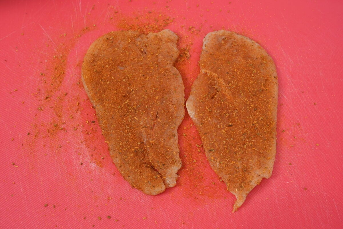 - Butterfly chicken breasts and pound flat with a meat mallet until even.