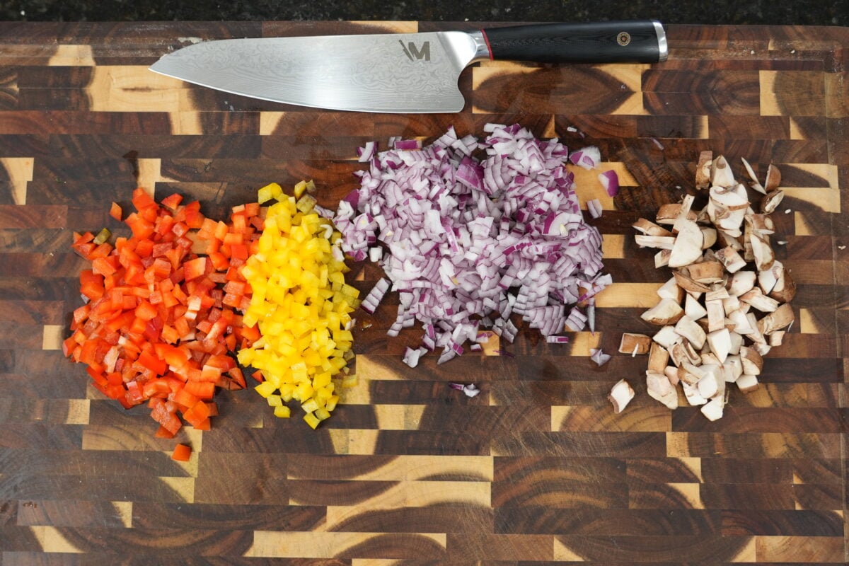 - Melt butter in a large skillet over medium heat. Add bell peppers, onion, and mushrooms. Season with salt and sauté 8-10 minutes until tender. Add garlic and cook 1 minute more.