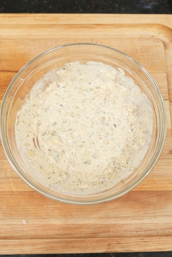 Mayonnaise, relish, capers, and lemon balance the richness of the fried fish with acidity and freshness.