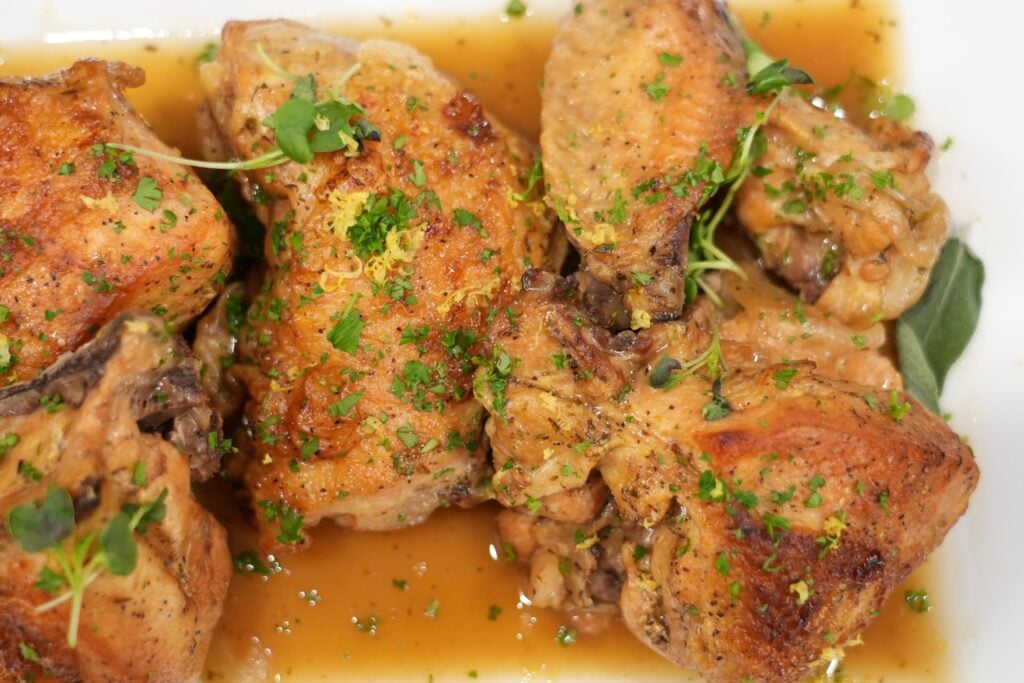 Remove chicken and place on a wire rack. Strain the braising liquid into a saucepan. Increase oven to 400°F and roast chicken on the rack until skin crisps. Simmer sauce until reduced, or thicken with a cornstarch slurry. Spoon sauce over chicken and garnish with parsley and lemon zest.