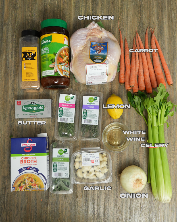 🥣 Key Ingredients: Whole chicken, fresh herbs, white wine, chicken stock, butter