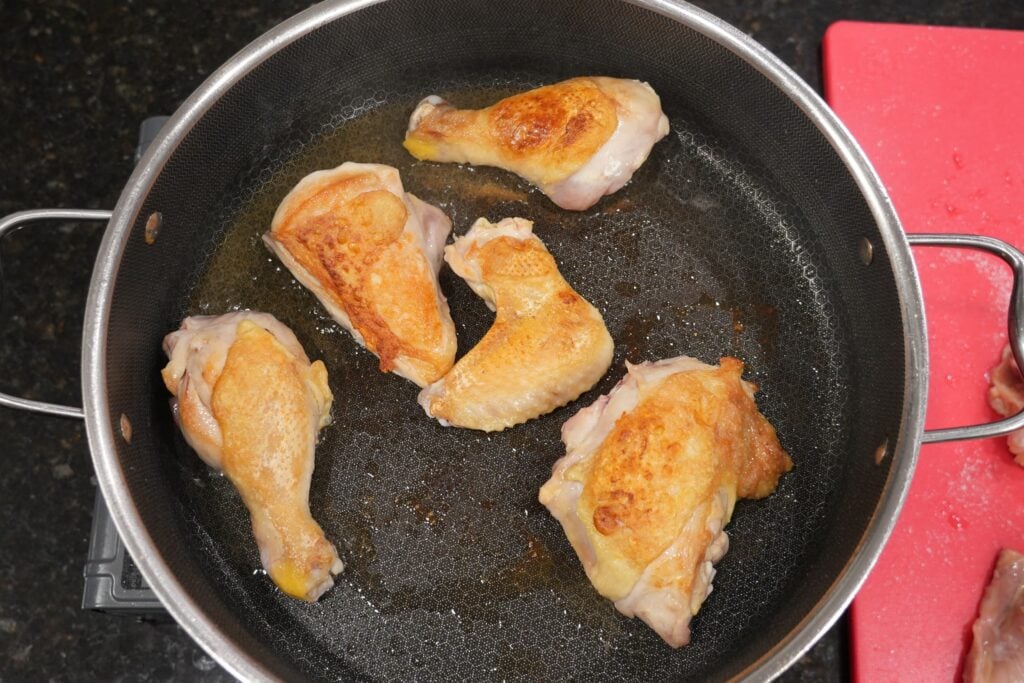 - Preheat your oven to 275°F. Heat a heavy skillet over medium-high heat and sear the chicken skin-side down until deeply golden. Flip and brown the other sides, then remove from the pan. Deglaze with white wine and scrape up all the browned bits.