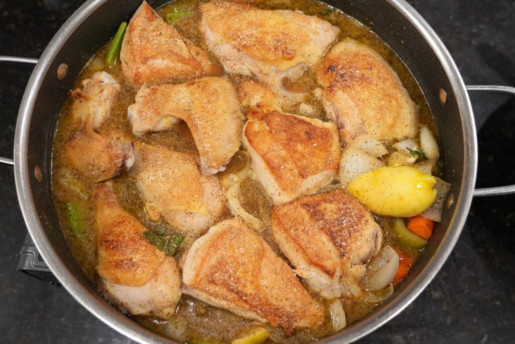 - Add chopped vegetables, garlic, herbs, butter, lemon zest and juice, and chicken stock. Bring to a boil, then reduce to a simmer. Return the chicken to the pan so the liquid comes about three-quarters of the way up the meat. Cover tightly and braise in the oven for about 90 minutes until very tender.