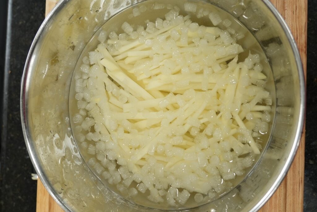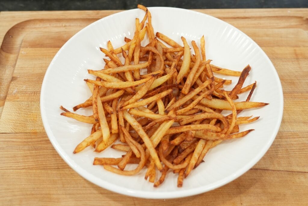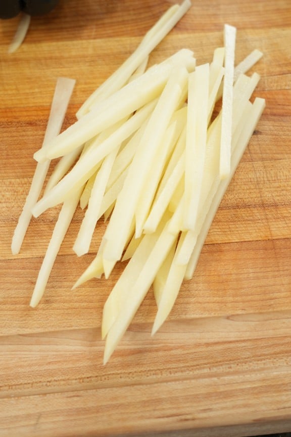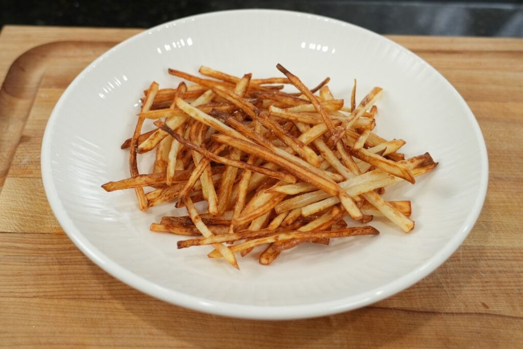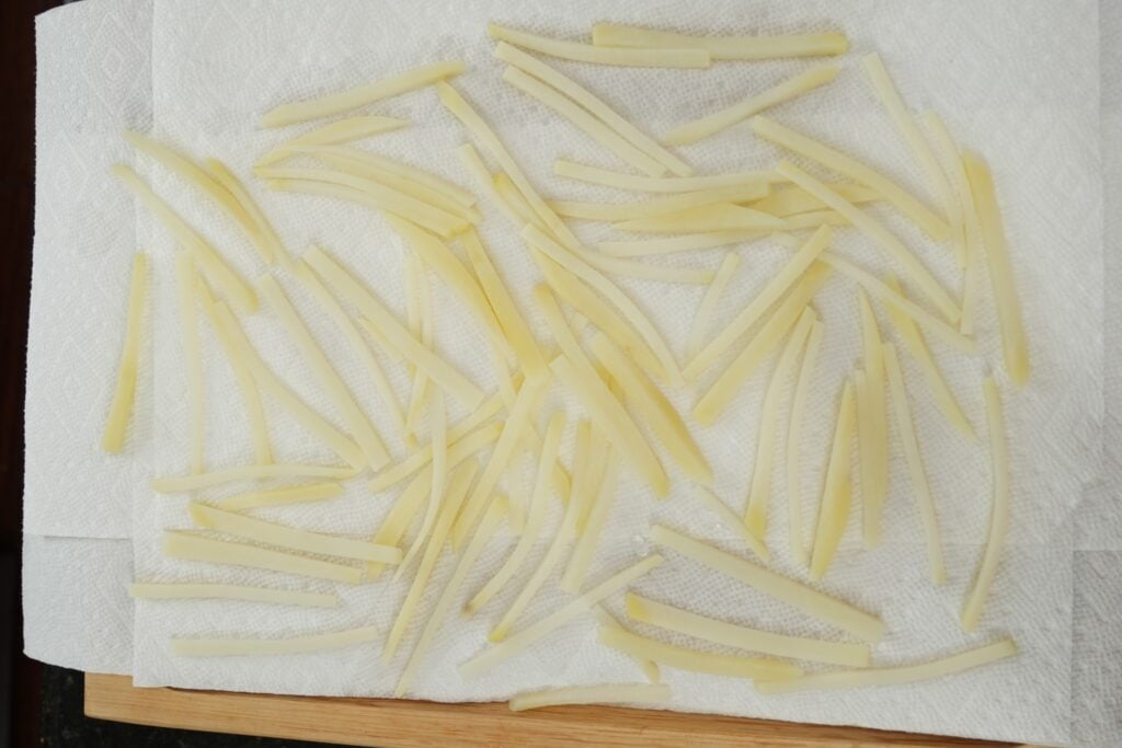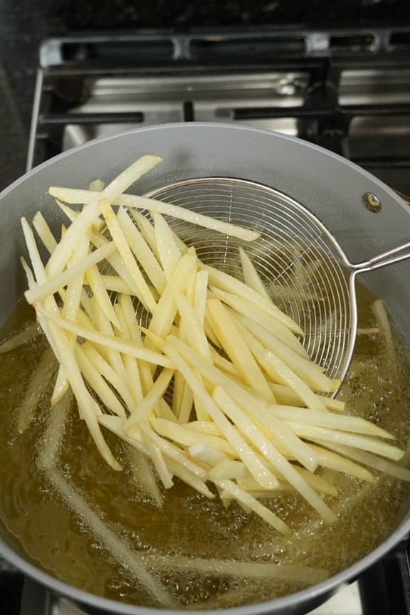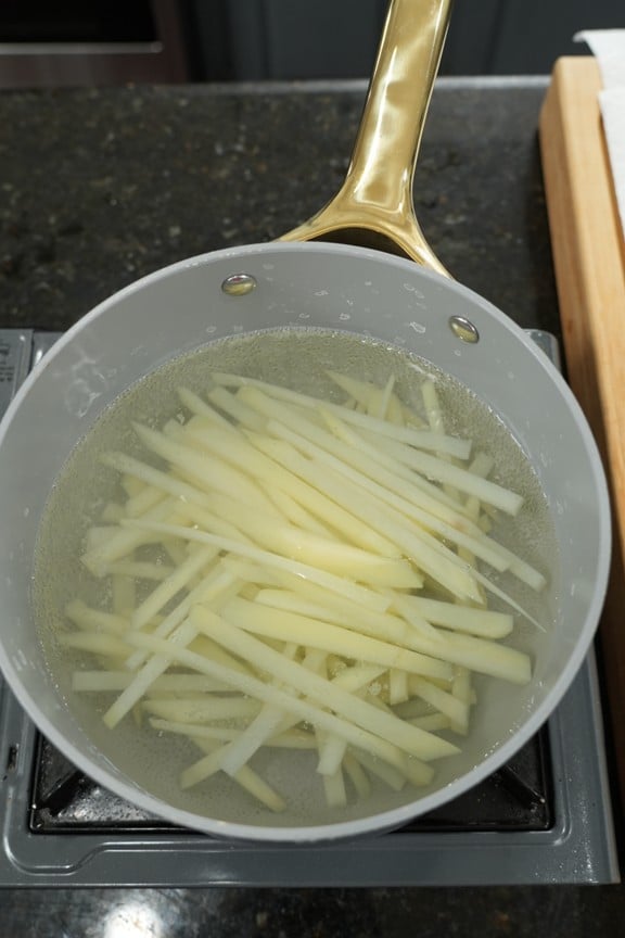 - For the air fryer version, bring a pot of water to a gentle simmer and cook the fries for 3–4 minutes until slightly tender. If using the deep fry method, heat oil to 300°F and fry the potatoes for 3–5 minutes until pale and softened but not browned.