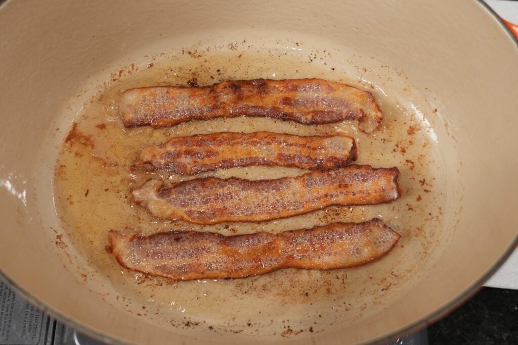 - Cook the diced bacon in a large Dutch oven over medium heat until crispy, then remove with a slotted spoon and leave 1–2 tablespoons of bacon fat in the pot.