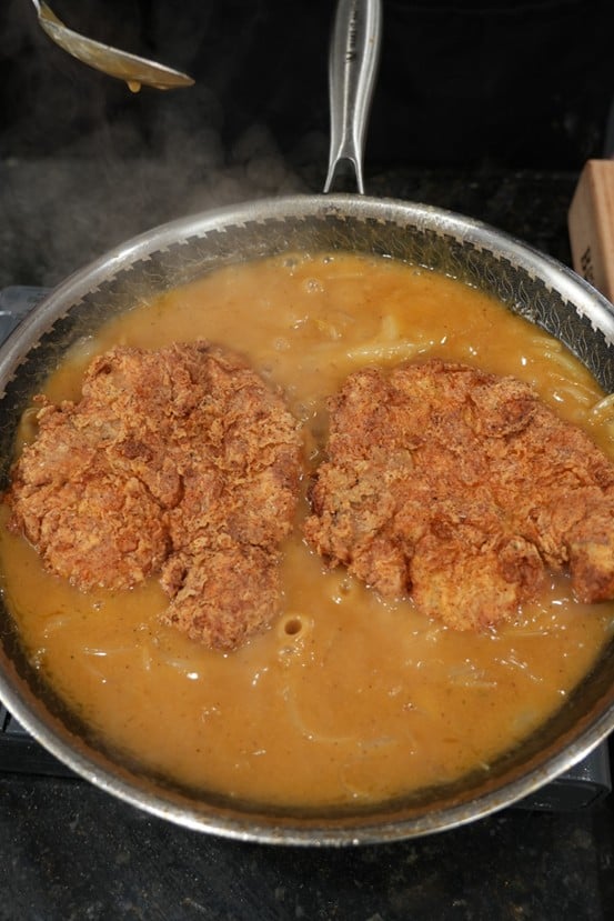 - Make gravy from pan drippings, onions, garlic, and stock, then smother the chops.