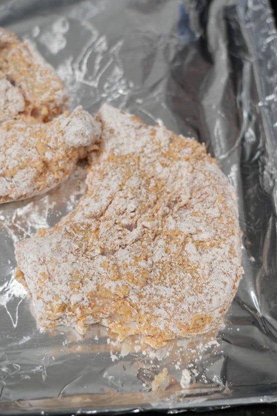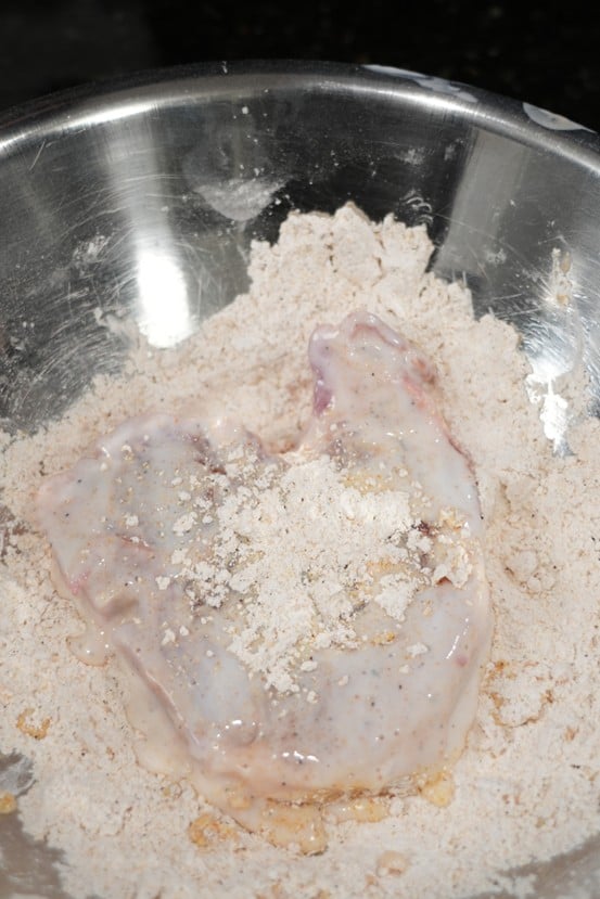 - Dredge the chops in seasoned flour, egg wash, then flour again.
